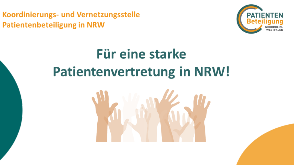 Seit 2004 ist die Patientenbeteiligung in Deutschland gesetzlich verankert. Dies hatte auch Auswirkungen auf Nordrhein-Westfalen: Die sogenannten maßgeblichen Patientenorganisationen auf Landesebene (VdK NRW, SoVD NRW, LAG SELBSTHILFE NRW, Gesundheitsselbsthilfe NRW, ZsL, Weibernetz, Verbraucherzentrale NRW, KOSKON und die Patientenstellen) gründeten den Koordinierungsausschuss NRW, um in Zukunft gemeinsam die Entsendung von Patientenvertreter*innen in die Gremien der gemeinsamen Selbstverwaltung des Gesundheitswesens zu beschließen.