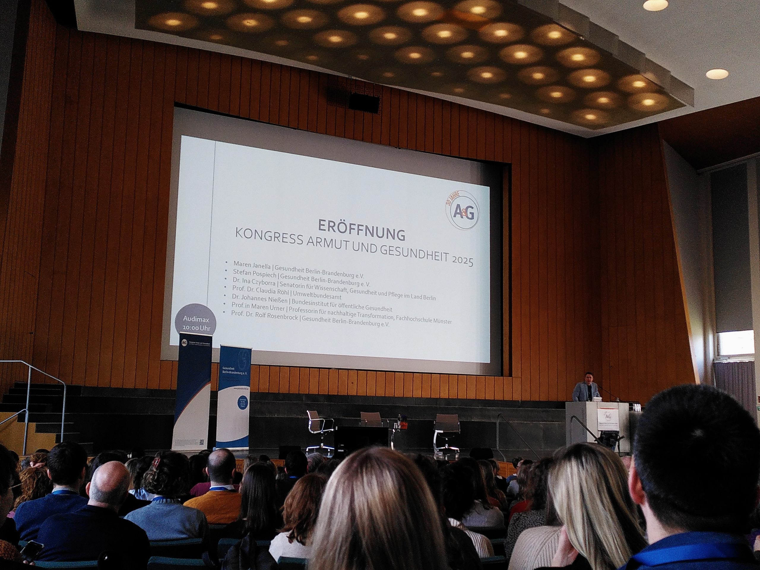 Am 17. und 18. März war die Projektstelle beim Kongress Armut und Gesundheit in Berlin vertreten, um mit rund 1.400 weiteren Teilnehmenden aus Zivilgesellschaft und Wissenschaft armutsbezogene Gesundheitsthemen zu diskutieren. Der Kongress fand in diesem Jahr unter dem Titel Gesundheit fördern, heißt Demokratie fördern statt. In einer Vielzahl von Workshops und Diskussionsrunden wurden unter anderem partizipative Möglichkeitsräume im Gesundheitswesen debattiert. Dabei standen marginalisierte Bevölkerungsgruppen im Fokus. Die Projektstelle konnte sich hilfreiche Impulse für die aktuelle Förderperiode des Projektes Patientenbeteiligung NRW einholen, in der Beteiligungsräume und Themen von bislang unterrepräsentierten Bevölkerungsgruppen in der Patientenvertretung und im Gesundheitswesen in NRW gemeinsam mit Multiplikator*innen reflektiert werden sollen. Im Workshop “Gesundheit unteilbar – Gemeinsam für einen gerechten und barrierefreien Zugang zu medizinischer Versorgung für Alle” präsentierte die Projektstelle zudem im Rahmen einer Arbeitsgruppe Kernforderungen der Patientenvertretung in NRW zur Sicherstellung der Barrierefreiheit in der ambulanten Versorgung. Diese wurden in den vergangenen Jahren gemeinsam mit Patientenvertreter*innen entwickelt und können hier nachgelesen werden: