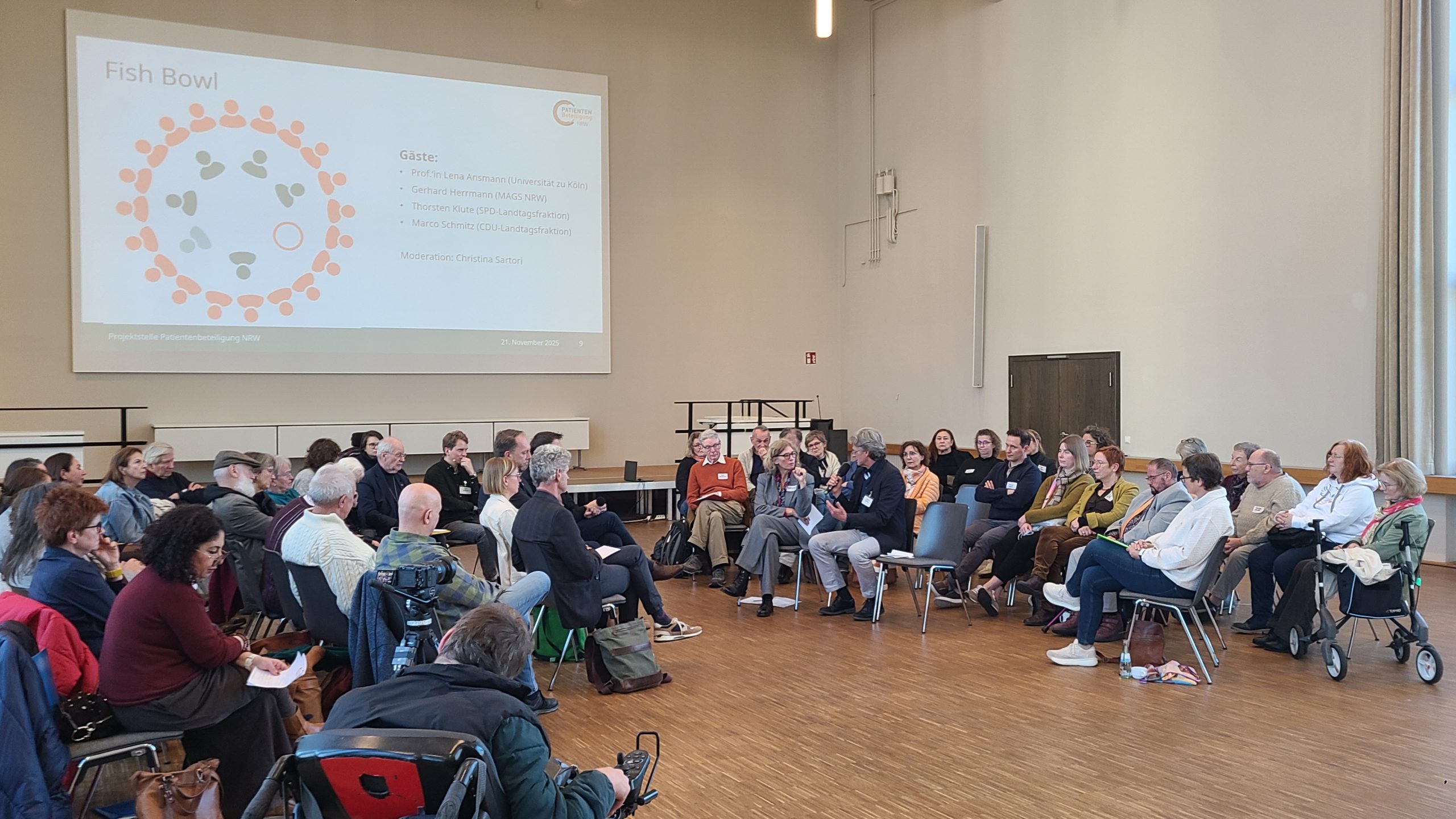 am Vormittag in Workshops entwickelten, waren am Nachmittag Grundlage für die Diskussion mit folgenden Gästen: Professorin Lena Ansmann (Lehrstuhl für Medizinsoziologie, Universität zu Köln), Gerhard Herrmann (Abteilungsleiter Gesundheitsversorgung, Krankenversicherung im MAGS NRW), Thorsten Klute (gesundheitspolitischer Sprecher der SPD-Landtagsfraktion) und Marco Schmitz (gesundheitspolitischer Sprecher der CDU-Landtagsfraktion) brachten die Perspektive von Politik, Verwaltung und Wissenschaft auf die erarbeiteten Themen ein. Christina Sartori (Wissenschaftsjournalistin) moderierte die Diskussion, die im Rahmen einer Fish Bowl auch das Publikum dazu einlud, sich einzumischen.